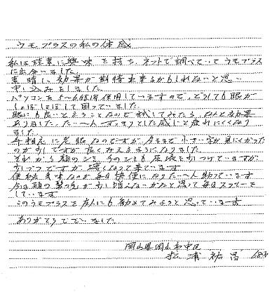 私は珪素に興味を持ち、ネットで調べていてクリスタルに出会いました。素晴しい効果が期待出来るかもしれないと思い申し込みました。パソコンを5-6時間使用していますので、どうしても眼がしょぼしょぼして困っていました。眼にも良いということなので試してみたら、なんと効果がありました。たいへんすっきりとした感じと疲れにくくなりました。手応えに老眼なのですが、今まで小さい字が見にくかったのが少しですが良く見えるようになりました。それから顔のシミ、手のシミも原液を少しつけていますが、少しづつですが、薄くなって来ています。便秘気味ですが毎日快便になりたいへん助かっています。今は頭の髪の毛が少し増えないかと思って毎日スプレーをしています。このクリスタルは家庭必需品として友人にも勧めてみようと思っています。ありがとうございました。